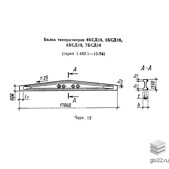 Балка двухскатная решетчатая 7БСД 18 размеры: длина, мм.: 11960, ширина, мм.: 330, высота, мм.: 1350, вес, кг.: 4700, марка бетона: . Изделия относятся к категории Балки железобетонные-Балка двухскатная решетчатая и изготавливаются по технической документации согласно ГОСТ 20372-90