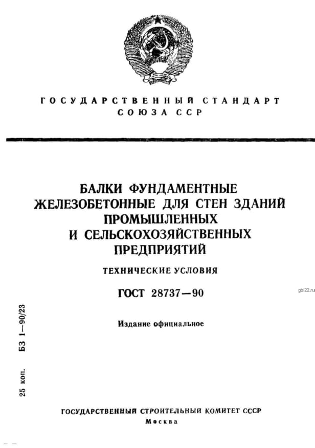 | Название стандарта | Балки фундаментные железобетонные для стен зданий промышленных и сельскохозяйственных предприятий. Технические условия. |
