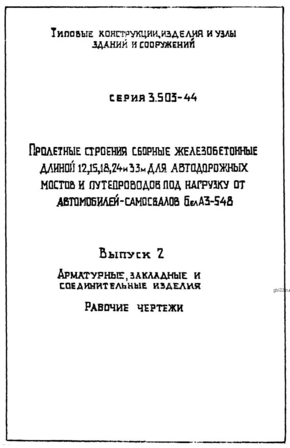 | Название стандарта | Пролетные строения сборные железобетонные длиной 12, 15, 18, 24 и 33 м для автодорожных мостов и путепроводов под нагрузку от автомобилей-самосвалов БелАЗ-548. |