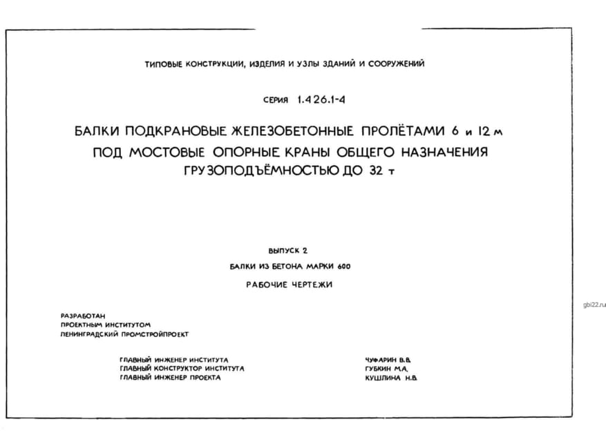 | Название стандарта | Балки подкрановые железобетонные пролетами 6 и 12 м под мостовые опорные краны общего назначения грузоподъемностью до 32 т. |