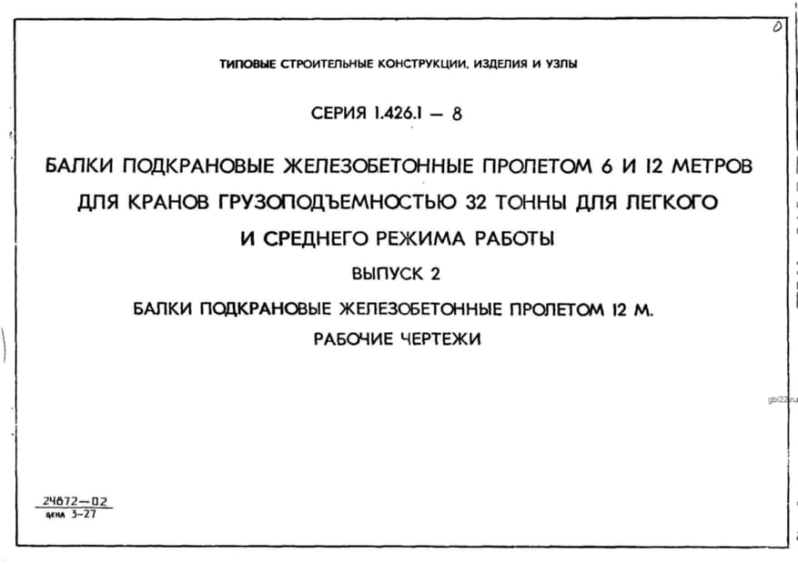 | Название стандарта | Балки подкрановые железобетонные пролетом 6 и 12 метров для кранов грузоподъемностью 32 тонны для легкого и среднего режима работы. |