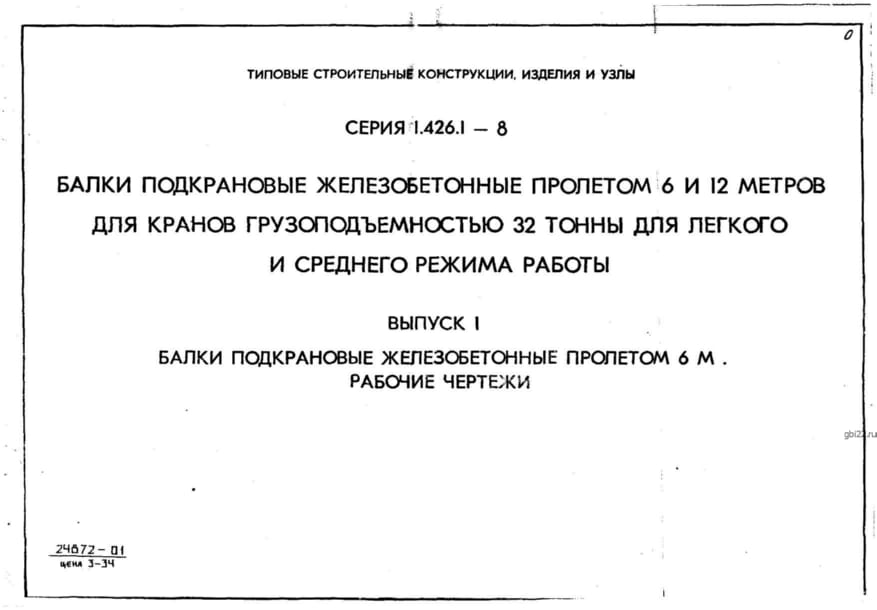 | Название стандарта | Балки подкрановые железобетонные пролетом 6 и 12 метров для кранов грузоподъемностью 32 тонны для легкого и среднего режима работы. |