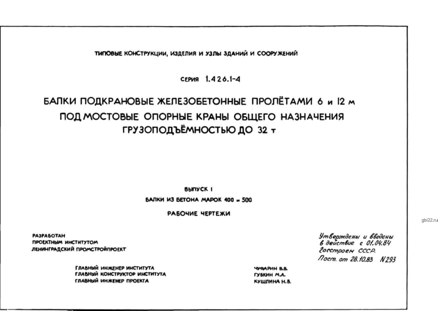 | Название стандарта | Балки подкрановые железобетонные пролетами 6 и 12 м под мостовые опорные краны общего назначения грузоподъемностью до 32 т. |