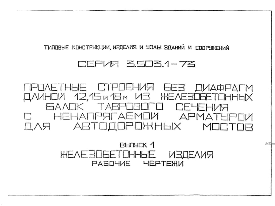 | Название стандарта | Пролетные строения без диафрагм длиной 12, 15 и 18 м из железобетонных балок таврового сечения с ненапрягаемой арматурой для автодорожных мостов. |