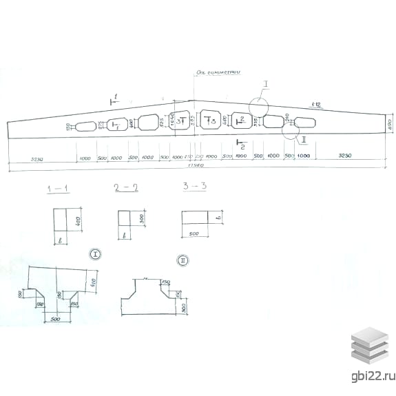 Балка двухскатная решетчатая 2БСД 18 размеры: длина, мм.: 17960, ширина, мм.: 240, высота, мм.: 1640, вес, кг.: 10400, марка бетона: . Изделия относятся к категории Балки железобетонные-Балка двухскатная решетчатая и изготавливаются по технической документации согласно ГОСТ 20372-90