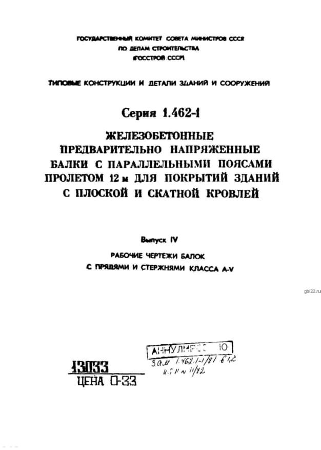 | Название стандарта | Железобетонные предварительно напряженные балки с параллельными поясами пролетом 12м для покрытий зданий с плоской и скатной кровлей. |