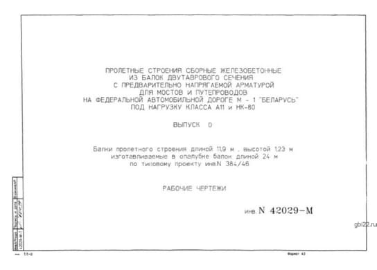 | Название стандарта | Пролетные строения сборные железобетонные из балок двутаврового сечения с предварительно напрягаемой арматурой для мостов и путепроводов на федеральной автомобильной дороге м-1 "Беларусь" под нагрузку класса А11 и НК-80. |