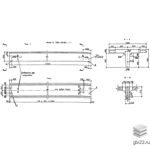 Железобетонная балка Б 1200-130-93 – это прочное прямоугольное изделие вытянутой формы с центральным выступом, который проходит по всей длине и придаёт конструкции тавровое поперечное сечение. Эти балки служат несущими элементами пролетных строений без диафрагм и находят применение в строительстве мостов и путепроводов на автомобильных магистралях общего назначения.