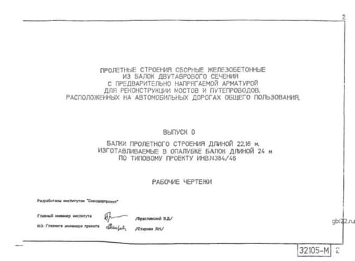 | Название стандарта | Пролетные строения сборные железобетонные из балок двутаврового сечения с предварительно напрягаемой арматурой для реконструкции мостов и путепроводов. Расположенных на автомобильных дорогах общего пользования. |