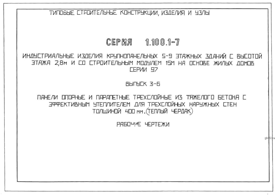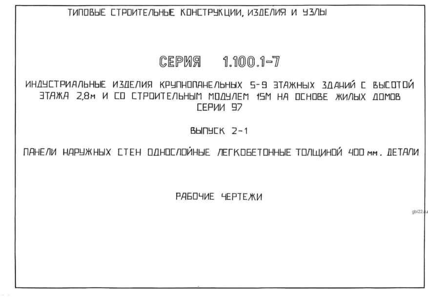 | Название стандарта | Индустриальные изделия крупнопанельных 5 – 9 этажных зданий с высотой этажа 2,8 м и со строительным модулем 15 м на основе жилых домов серии 97. Выпуск 0. Состав серии. Материалы для проектирования. |
