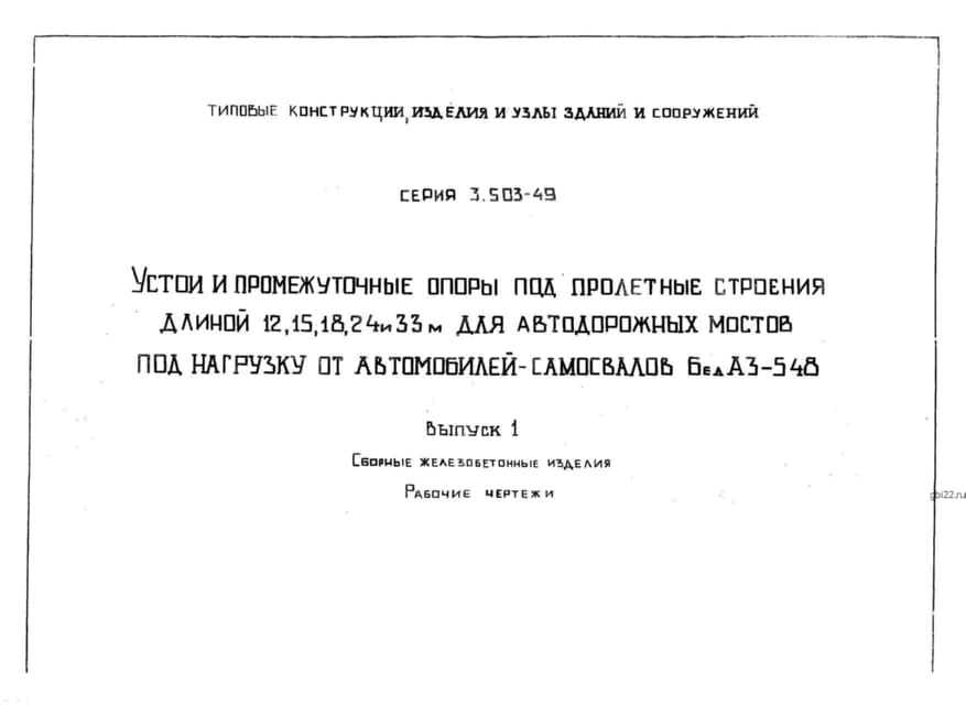 | Название стандарта | Устои и промежуточные опоры под пролетные строения длиной 12, 15, 18, 24 и 33 м для автодорожных мостов под нагрузку от автомобилей-самосвалов БелАЗ-548. |