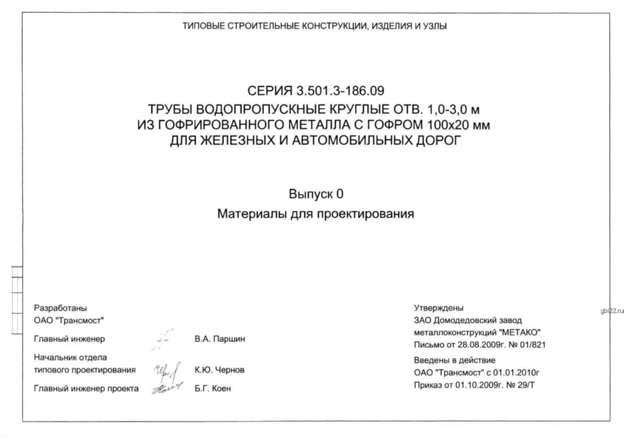 | Название стандарта | Трубы водопропускные круглые отв. 1,0 - 3,0 м из гофрированного металла с гофром 100х20 мм для железных и автомобильных дорог. |