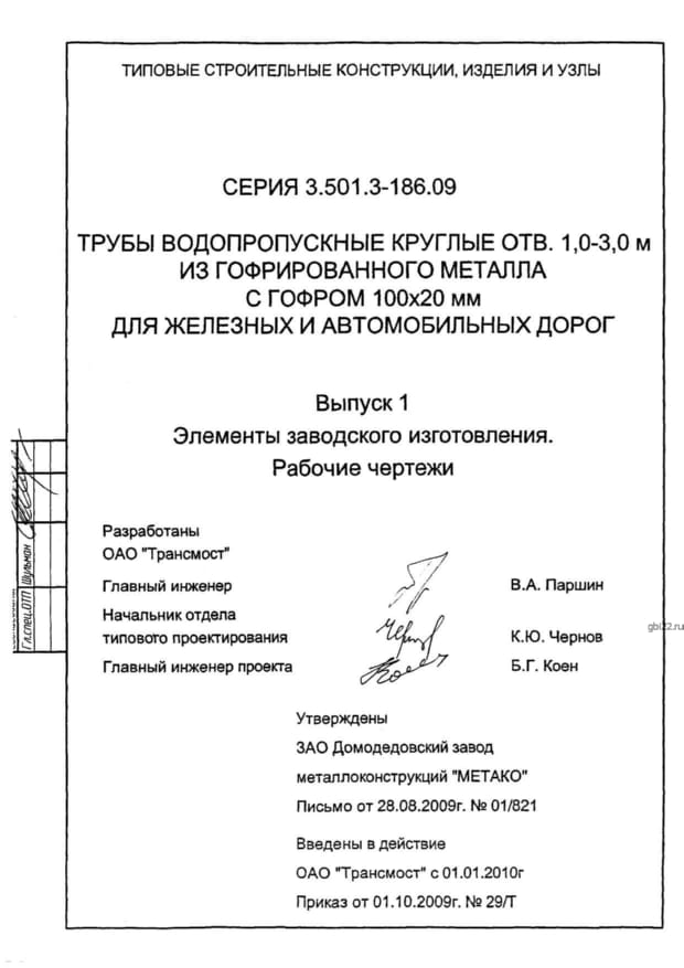 | Название стандарта | Трубы водопропускные круглые отв. 1,0 - 3,0 м из гофрированного металла с гофром 100х20 мм для железных и автомобильных дорог. |