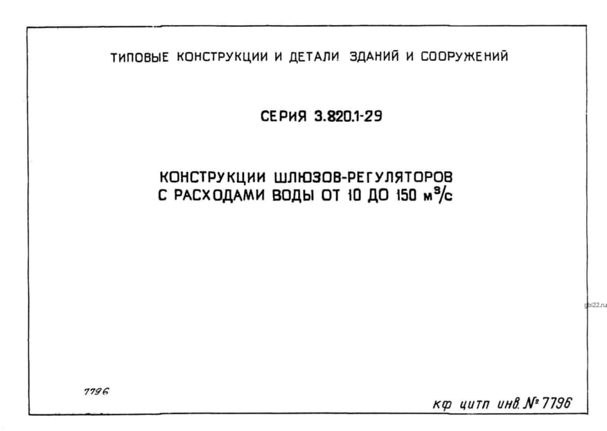| Название стандарта | Конструкции шлюзов-регуляторов с расходами воды от 10 до 150 м.куб/с. |