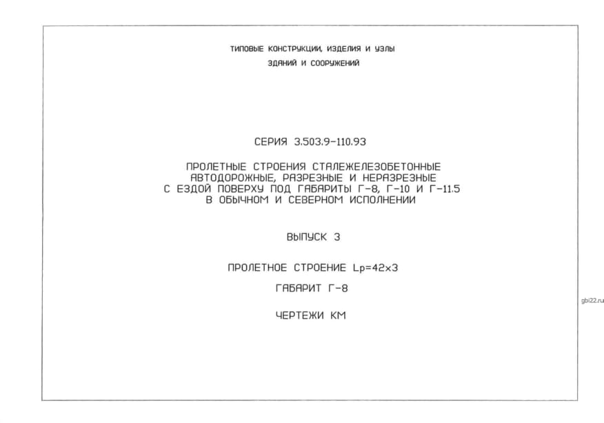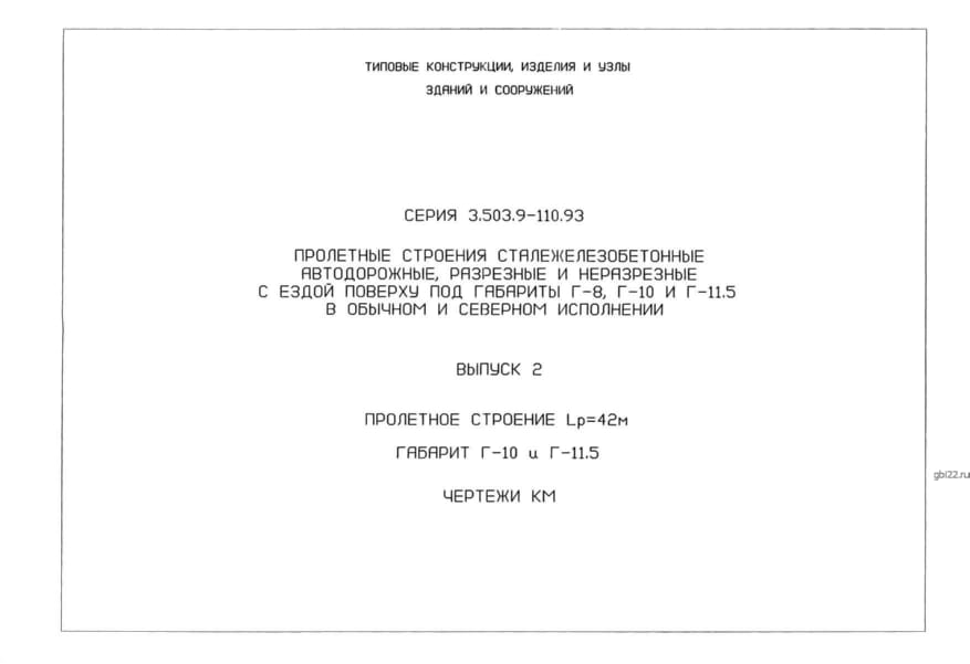 | Название стандарта | Пролетные строения сталежелезобетонные автодорожные, разрезные и неразрезные с ездой поверху под габариты Г-8, Г-10 и Г-11,5 в обычном и северном исполнении. |