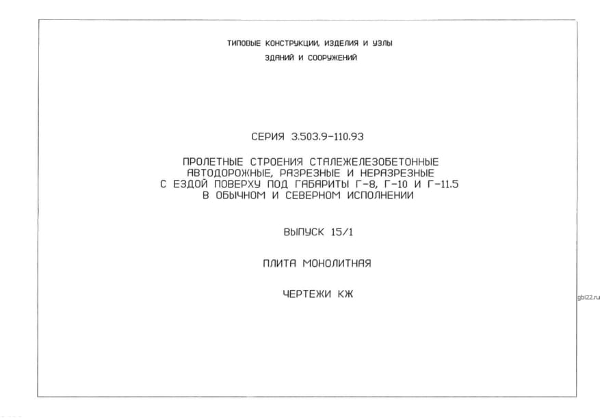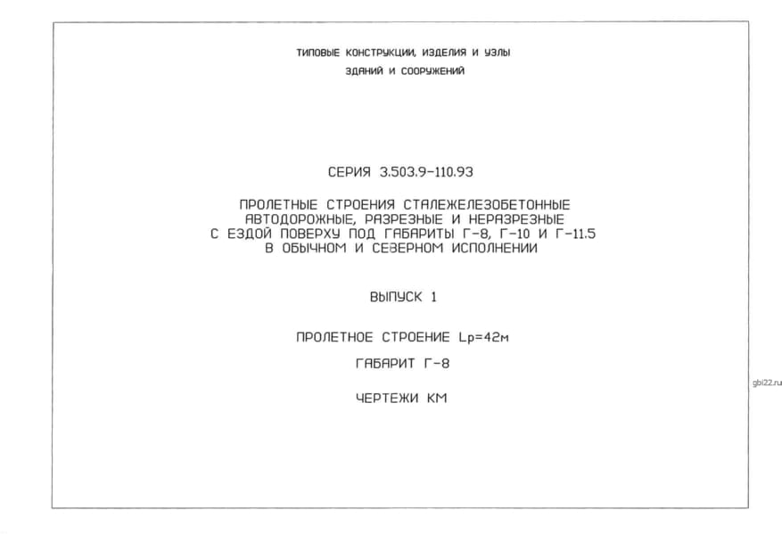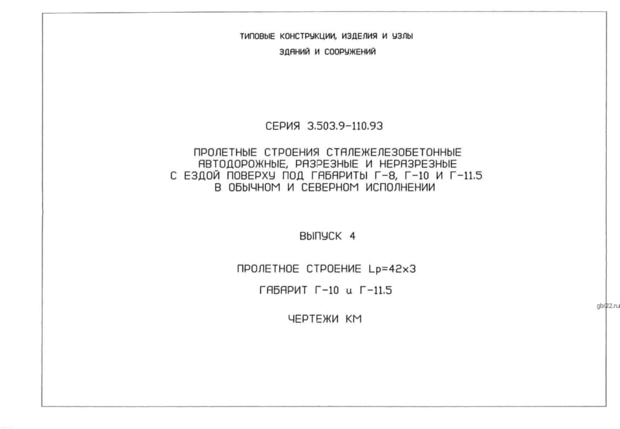 | Название стандарта | Пролетные строения сталежелезобетонные автодорожные, разрезные и неразрезные с ездой поверху под габариты Г-8, Г-10 и Г-11,5 в обычном и северном исполнении. |