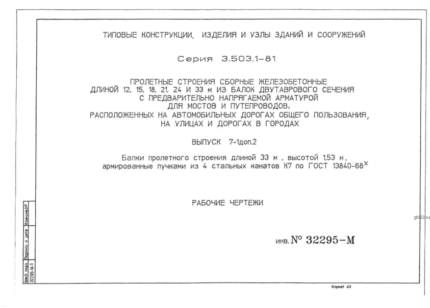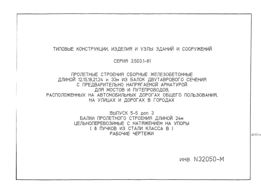 | Название стандарта | Пролетные строения сборные железобетонные длиной 12, 15, 18, 21, 24 и 33 м из балок двутаврового сечения с предварительно напрягаемой арматурой для мостов и путепроводов, расположенных на автомобильных дорогах общего пользования, на улицах и дорогах в гор |