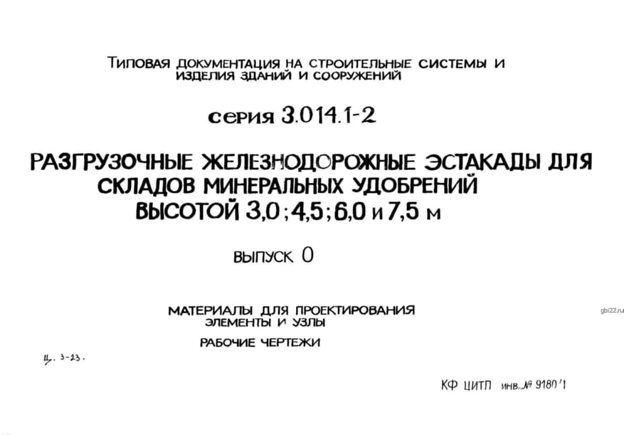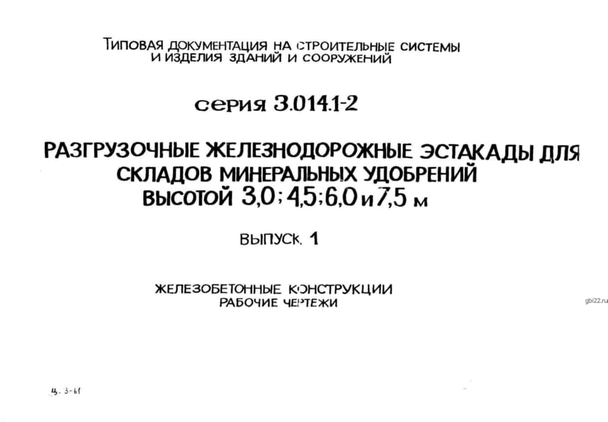 | Название стандарта | Разгрузочные железнодорожные эстакады для складов минеральных удобрений высотой 3,0; 4,5; 6,0 и 7,5 м. |