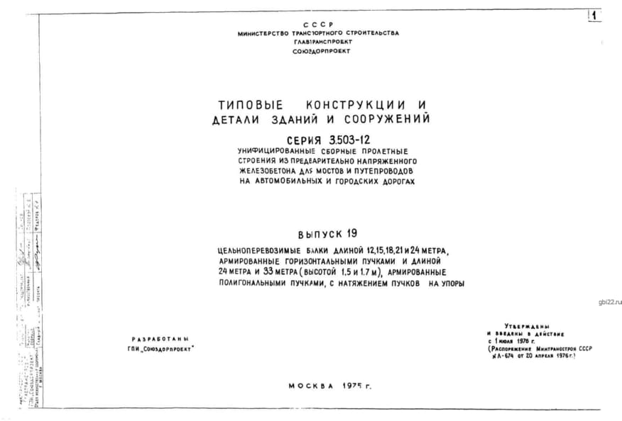 | Название стандарта | Унифицированные сборные пролетные строения из предварительно напряженного железобетона для мостов и путепроводов на автомобильных и городских дорогах. |