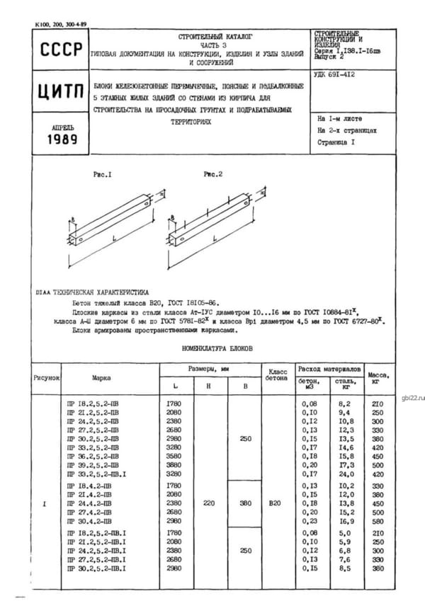 | Название стандарта | Блоки железобетонные перемычечные. поясные и подбалконные 5-этажных жилых зданий со стенами из кирпича для строительства на просадочных грунтах и подрабатываемых территориях. |