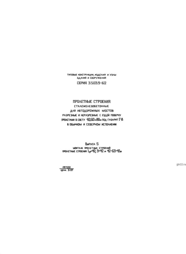 | Название стандарта | Пролетные строения сталежелезобетонные для автодорожных мостов разрезные и неразрезные с ездой поверху пролетами в свету 40, 60 и 80 м под габарит Г-8 в обычном и северном исполнении. |