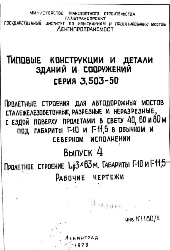| Название стандарта | Пролетные строения для автодорожных мостов, сталежелезобетонные разрезные и неразрезные с ездой поверху, пролетами в свету 40, 60 и 80 м под габариты Г-10 и Г-11,5 в обычном и северном исполнении. |