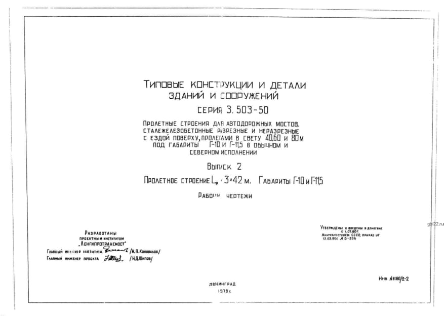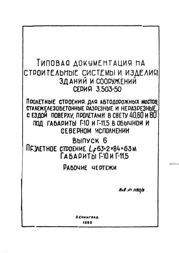 | Название стандарта | Пролетные строения для автодорожных мостов, сталежелезобетонные разрезные и неразрезные с ездой поверху, пролетами в свету 40, 60 и 80 м под габариты Г-10 и Г-11,5 в обычном и северном исполнении. |