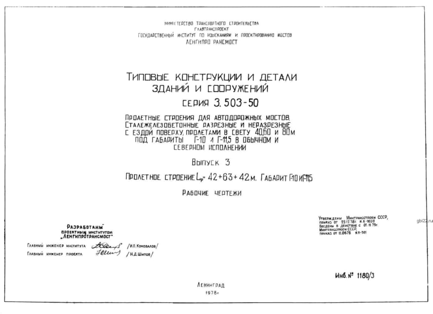 | Название стандарта | Пролетные строения для автодорожных мостов, сталежелезобетонные разрезные и неразрезные с ездой поверху, пролетами в свету 40, 60 и 80 м под габариты Г-10 и Г-11,5 в обычном и северном исполнении. |