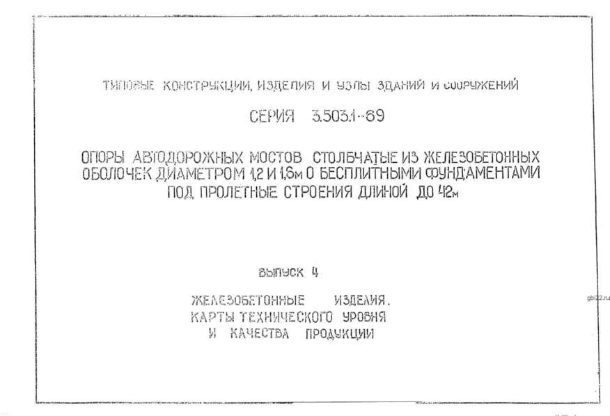 | Название стандарта | Опоры автодорожных мостов столбчатые из железобетонных оболочек диаметром 1,2 и 1,6 м с безплитными фундаментами под пролетные строения длиной до 42 м. |