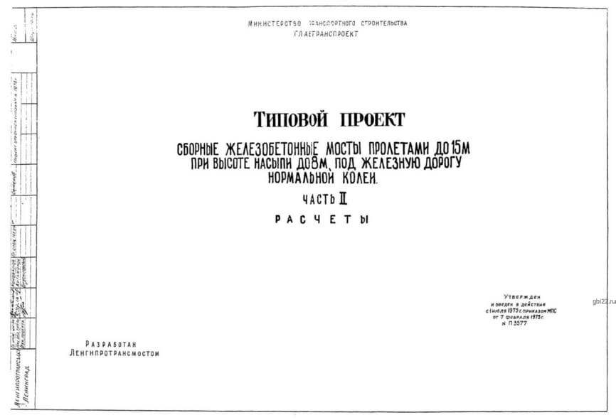 | Название стандарта | Сборные железобетонные мосты пролетами до 15 м при высоте насыпи до 8 м под железную дорогу нормальной колеи. |