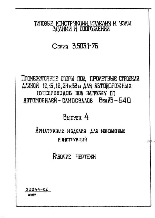 | Название стандарта | Промежуточные опоры под пролетные строения длиной 12, 15, 18, 24 и 33 м для автодорожных путепроводов под нагрузку от автомобилей-самосвалов БелАЗ-540. |