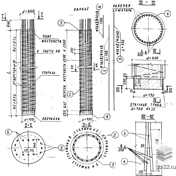 Формовка изделий осуществляется в стальных опалубках, что гарантирует соблюдение геометрических пропорций и высокое качество лицевых поверхностей. Рекомендуется использовать тяжелый бетон марки М400 с морозостойкостью не ниже F300. Армирование выполняется отдельными стержнями, соединяемыми контактной точечной сваркой и хомутами, наматываемыми по спирали. Для распределительного армирования применяется сталь класса AI марок ВСт3пс2, а для рабочего армирования – сталь класса AII марки 10ГТ диаметром от 10 до 32 мм. Также используется сталь класса AIII марки 25Г2С диаметром стержней от 8 до 32 мм.