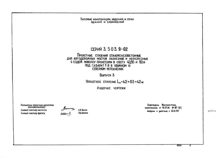 | Название стандарта | Пролетные строения сталежелезобетонные для автодорожных мостов разрезные и неразрезные с ездой поверху пролетами в свету 40, 60 и 80 м под габарит Г-8 в обычном и северном исполнении. |