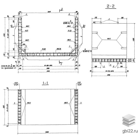 Армирование блока выполняется пространственным каркасом, собранным из плоских каркасов. Рабочая и поперечная арматура изготовлены из горячекатаной стали класса А-III. В блоках предусмотрены закладные детали для упрощения соединения изделий и крепления оборудования. Для удобства погрузочно-разгрузочных работ блоки оснащаются монтажными петлями из арматурной стали класса А-I.