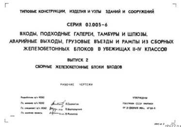 | Название стандарта | Входы, подходные галереи, тамбуры и шлюзы, аварийные выходы, грузовые въезды и рампы из сборных железобетонных блоков в убежищах II-IV классов. |