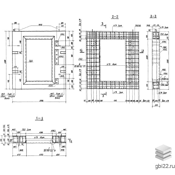 Армирование блоков осуществляется с помощью пространственного каркаса, собранного из плоских каркасов. Рабочая и поперечная арматура выполнены из горячекатаной стали класса A-III. В блоках предусмотрены закладные детали, упрощающие процессы соединения изделий и крепления оборудования.