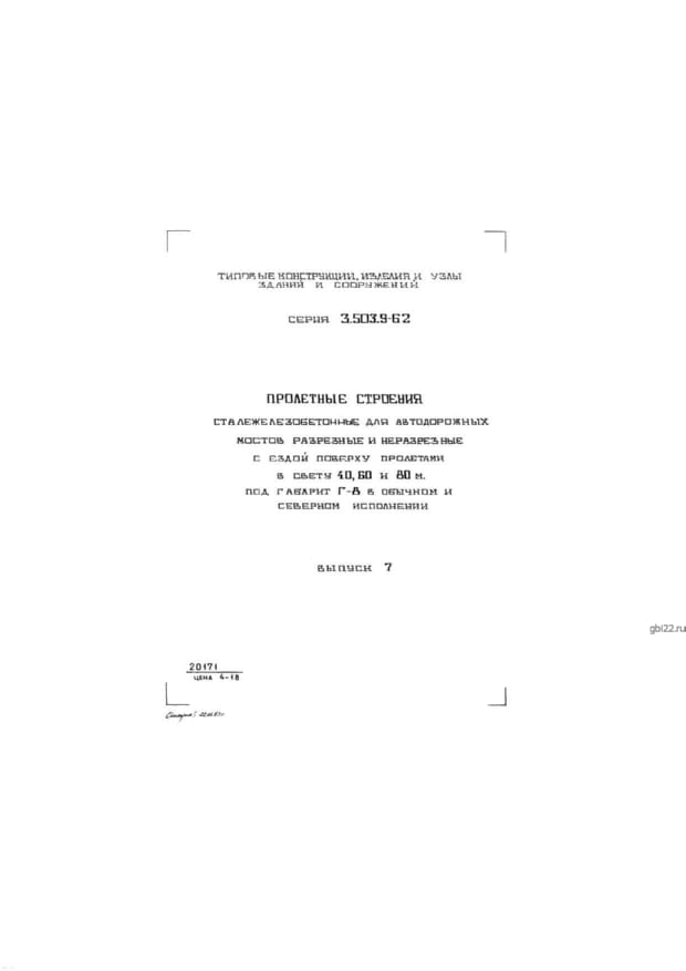 | Название стандарта | Пролетные строения сталежелезобетонные для автодорожных мостов разрезные и неразрезные с ездой поверху пролетами в свету 40, 60 и 80 м под габарит Г-8 в обычном и северном исполнении. |