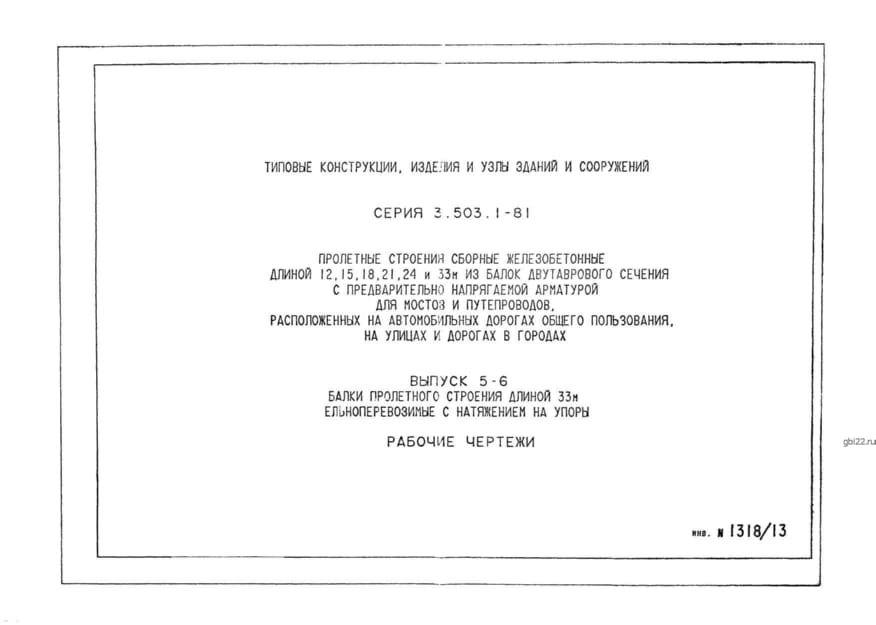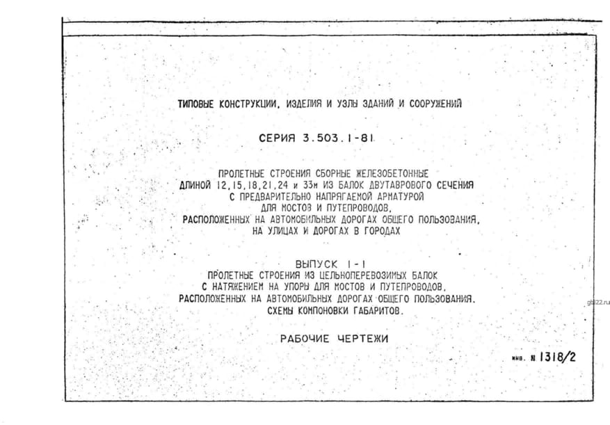 | Название стандарта | Пролетные строения сборные железобетонные длиной 12, 15, 18, 21, 24 и 33 м из балок двутаврового сечения с предварительно напрягаемой арматурой для мостов и путепроводов, расположенных на автомобильных дорогах общего пользования, на улицах и дорогах в гор |