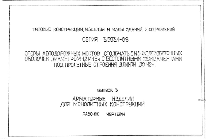 | Название стандарта | Опоры автодорожных мостов столбчатые из железобетонных оболочек диаметром 1,2 и 1,6 м с безплитными фундаментами под пролетные строения длиной до 42 м. |
