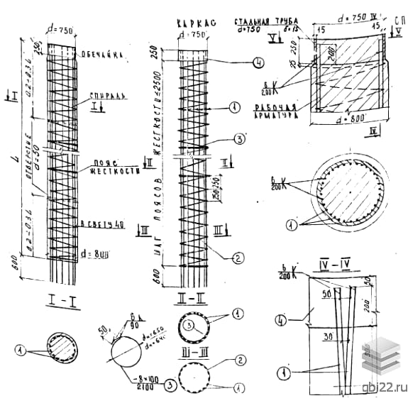 Конструкции армируются отдельными стержнями, которые соединяются с помощью контактной точечной сварки и спиральных хомутов. Для распределительного армирования используется сталь класса AI марок ВСт3пс2, соответствующая требованиям ГОСТ 5781-75. Рабочее армирование выполняется из стали класса AII марки 10ГТ диаметром от 10 до 32 мм, а также сталь класса AIII марки 25Г2С диаметром стержней от 8 до 32 мм.