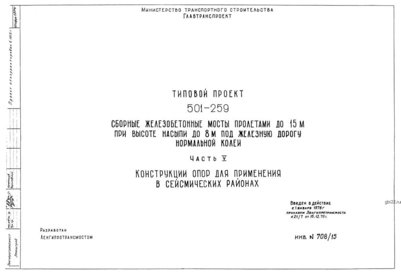 | Название стандарта | Сборные железобетонные мосты пролетами до 15 м при высоте насыпи до 8 м под железную дорогу нормальной колеи. |