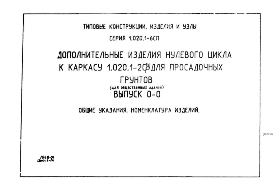 | Название стандарта | Дополнительные изделия нулевого цикла к каркасу 1.020.1-2с/89 для просадочных грунтов (для общественных зданий). |