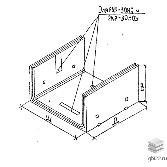 Элементы коллектора РКР 30 НУ – высокопрочные железобетонные конструкции П-образной формы. Используются в качестве нижних и верхних частей каркаса. Оснащены закладными деталями для крепления опор и смежных блоков, а также углублениями для строповочных петель.