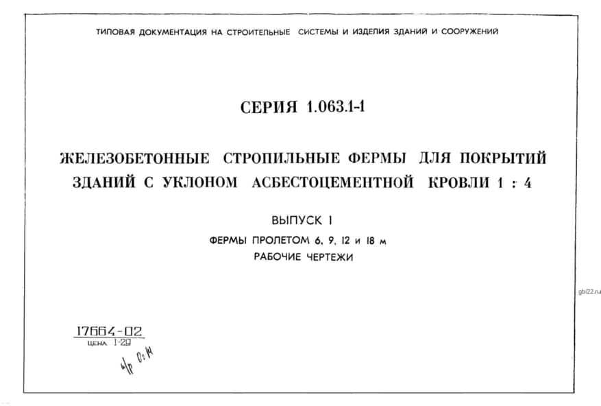 | Название стандарта | Железобетонные стропильные фермы для покрытий зданий с уклоном асбестоцементной кровли 1:4. |