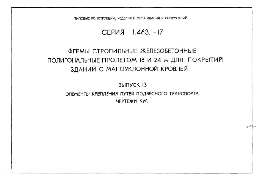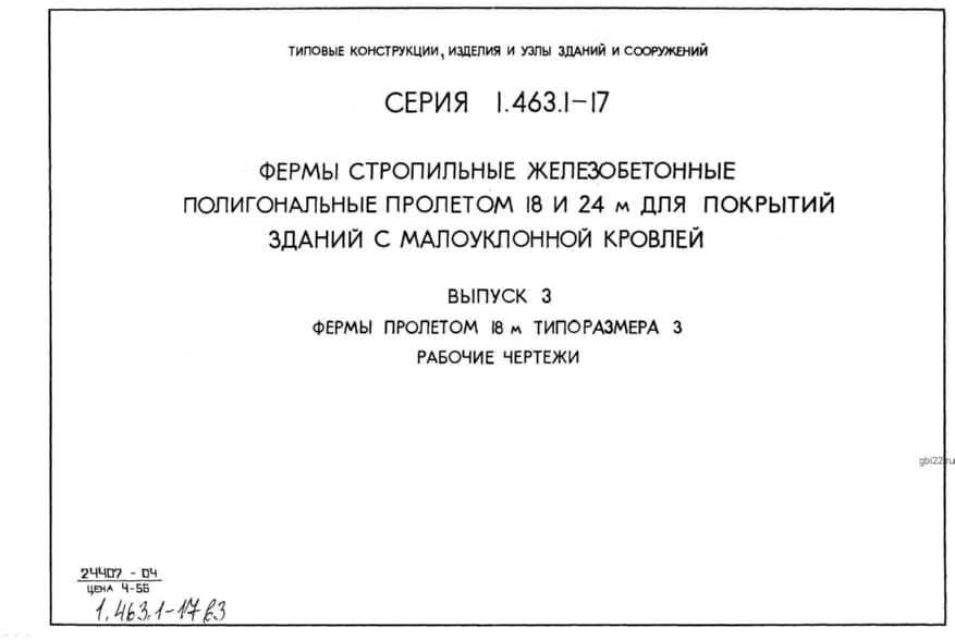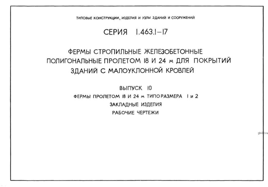 | Название стандарта | Фермы стропильные железобетонные полигональные пролетами 18 и 24 м для покрытий зданий с малоуклонной кровлей. |