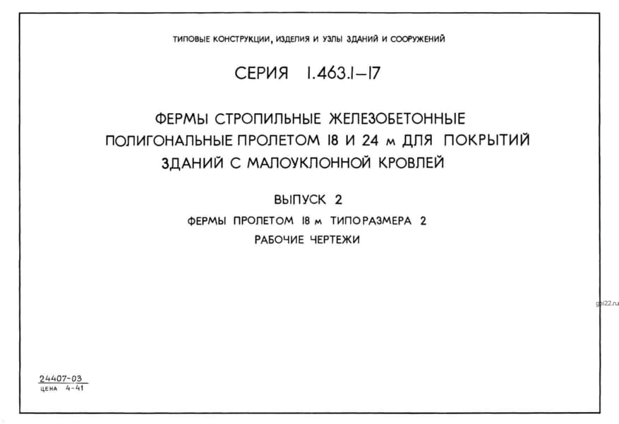 | Название стандарта | Фермы стропильные железобетонные полигональные пролетами 18 и 24 м для покрытий зданий с малоуклонной кровлей. |