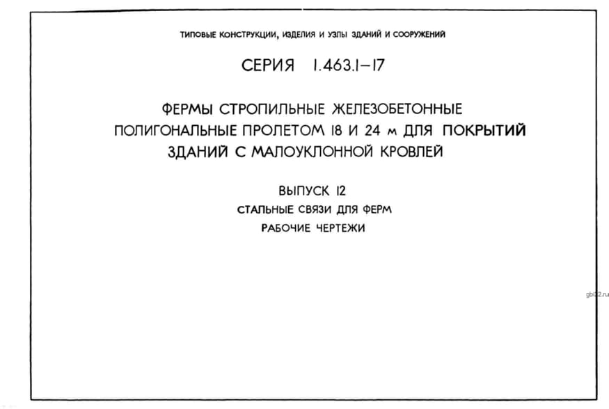 | Название стандарта | Фермы стропильные железобетонные полигональные пролетами 18 и 24 м для покрытий зданий с малоуклонной кровлей. |