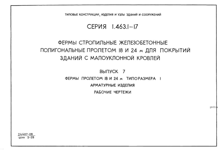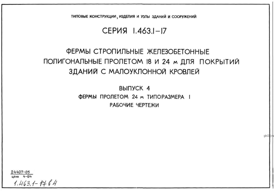 | Название стандарта | Фермы стропильные железобетонные полигональные пролетами 18 и 24 м для покрытий зданий с малоуклонной кровлей. |