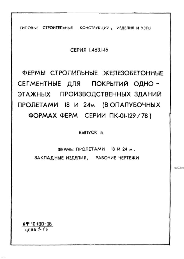 | Название стандарта | Фермы стропильные железобетонные сегментные для покрытий одноэтажных производственных зданий пролетами 18 и 24 м (в опалубочных формах ферм серии ПК-01-129/78). |