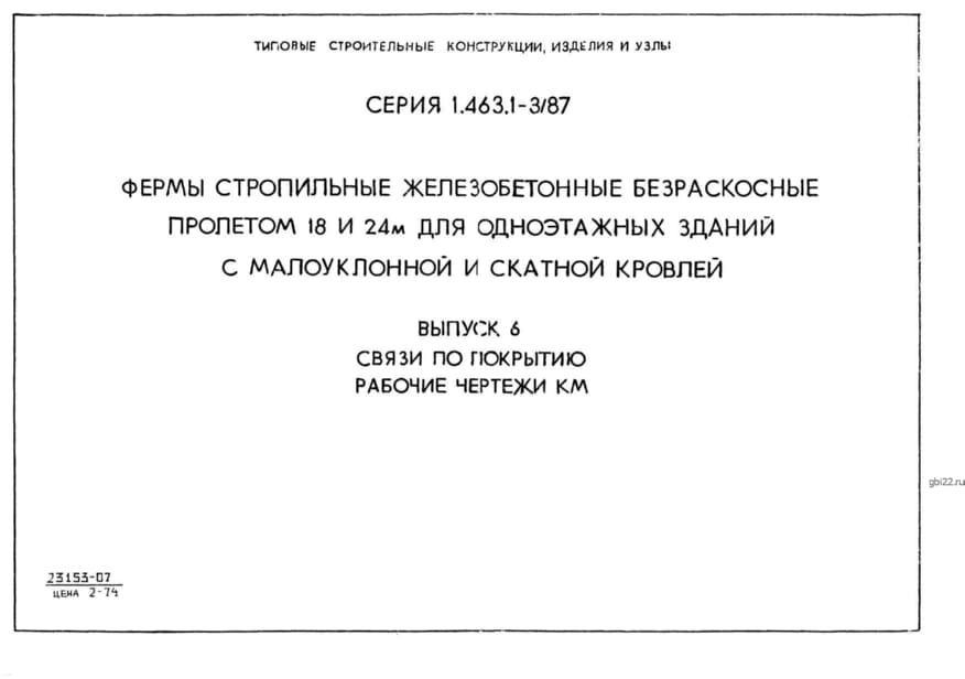 | Название стандарта | Фермы стропильные железобетонные безраскосные пролетом 18 и 24 м для одноэтажных зданий с малоуклонной и скатной кровлей. |